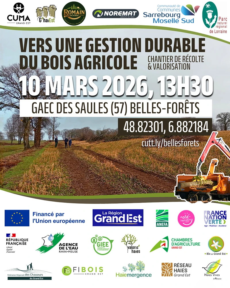 Une journée en partenariat avec Communauté de Communes Sarrebourg Moselle Sud CCSMS, Parc naturel régional de Lorraine, Romain Scierie, Chambre d’Agriculture Grand Est, Chambre d’agriculture AlsaceChambre d’agriculture de Meurthe-et-Moselle, Chambre d’agriculture de la Moselle, Chambre d’Agriculture des Ardennes, Chambre d’Agriculture Meuse, Chambre d’Agriculture des Vosges & Agriculture Biologique en Grand Est, Fédération des Chasseurs du Grand Est – FRCGE, Fibois Grand Est, Haiemergence, Réseau Haies, Haies vives d’Alsace