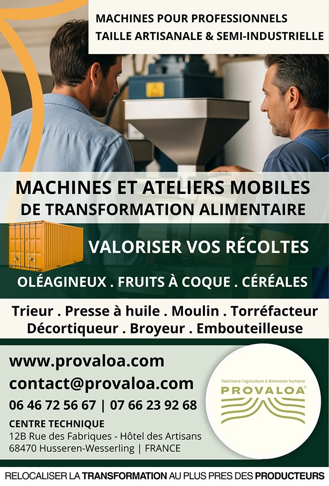Notre mission : Préserver et valoriser la diversité végétale des terroirs en relocalisant la production alimentaire artisanale, durable et rentable pour les producteurs. Nous proposons des équipements et concevons des lignes complètes de transformation végétale (oléagineux, fruits à coque et céréales) de taille artisanale et semi-industrielle capables de fonctionner en continu.