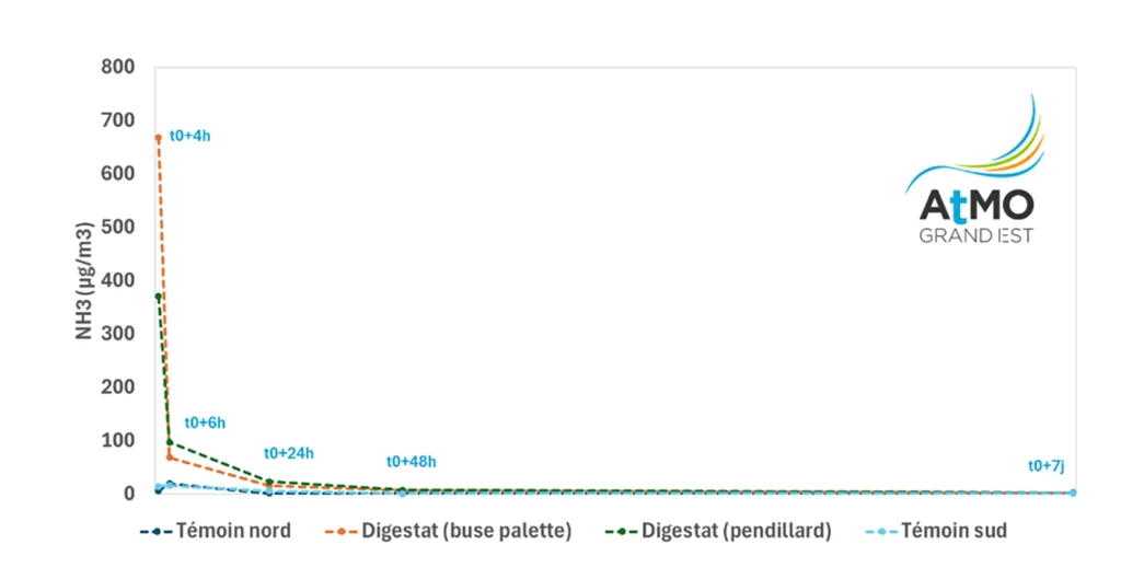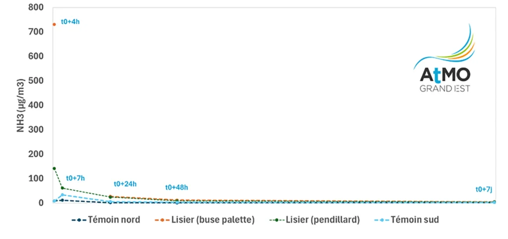 Les niveaux de concentrations en ammoniac mesurés au cours de cette expérimentation ont montré des dynamiques émissives similaires entre les deux modes d’épandages et les deux types d’effluents, à savoir : des niveaux de concentrations élevés sur les 4 premières heures après application (un maximum de 730 µg/m3 a été relevé après application du lisier via buse palette, concentration dans l’air 70 fois plus élevée que hors influence), suivi d’une baisse importante les heures suivantes jusqu’à revenir à des niveaux faibles et homogènes après une semaine.