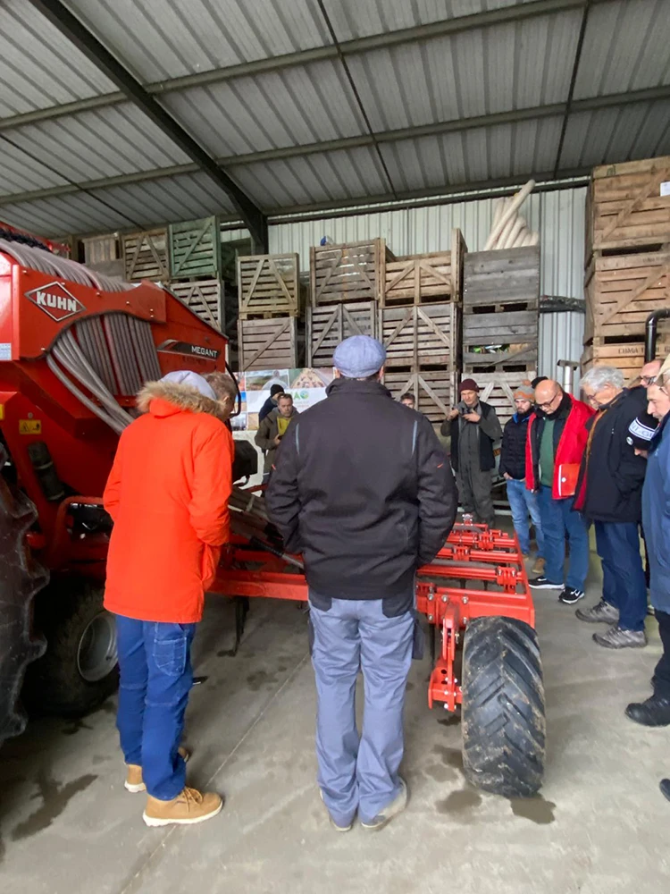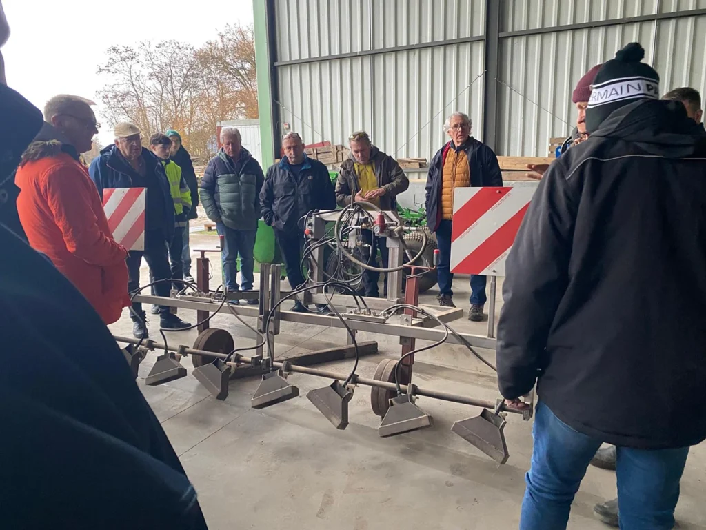 Après un repas commun, l’après-midi était consacrée à la visite de la CUMA Terre et Prés dans le cadre du Mois de la bio. La CUMA Terre et Prés (Valff) est aujourd’hui composée de 36 adhérents aux profils variés, et dispose d’une quinzaine de matériels. Les adhérents sont situés dans un large rayon autour de Valff-Obernai, et beaucoup ont des cultures diversifiées : céréales, légumes, pomme de terre, houblon. La majorité des membres de la CUMA sont en agriculture biologique. La CUMA était engagée dans un GIEE depuis 2022 et jusqu’à cette année, et a travaillé sur des thématiques autour des pratiques agroécologiques innovantes (non-labour, thés de compost oxygénés, enrobage de semences, chromatographies de sol, …).