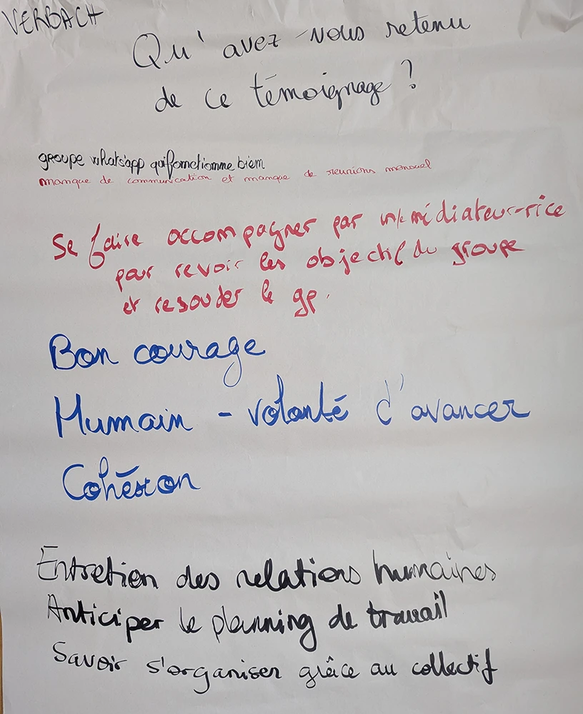 À chaque témoignage, les animatrices et animateurs des différents groupes ont ainsi invités chacun et chacune à résumer en quelques mots ce que leur a inspiré les échanges.